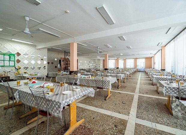 Столовая санатория находится на 2-м этаже двухэтажного корпуса и состоит из трех залов. Организовано 5-и разовое питание по системе «меню-заказ» (три основных приема пищи (завтрак, обед, ужин) и легкий полдник и вечерним приемом кефира). Бланк заказа предоставляют гостям при заезде. Системе питания санатория придается большое значение, ведь правильное и сбалансированное питание – залог успеха в общем оздоровительном процессе.